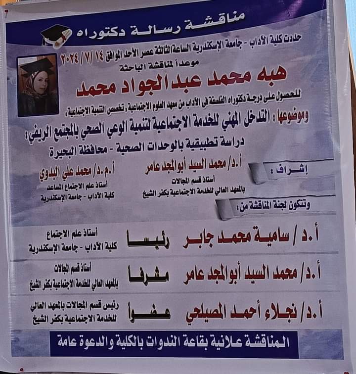 جاءت الرسالة بعنوان «التدخل المهني للخدمة الاجتماعية لتنمية الوعي الصحي بالمجتمع الريفي» ، دراسة تطبيقية بالوحدات الصحية بمحافظة البحيرة.
