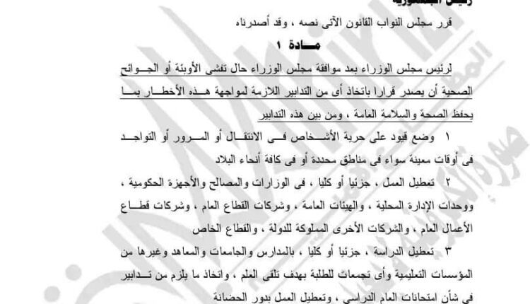 3- تعطيل الدراسة لمدة محددة جزئياً أو كلياً، بالمدارس والجامعات والمعاهد وغيرها من المؤسسات التعليمية وأي تجمعات للطلبة بهدف تلقي العلم، واتخاذ ما يلزم من تدابير في شأن امتحانات العام الدراسي، وتعطيل العمل بدور الحضانة.