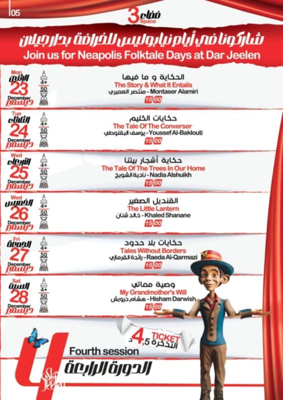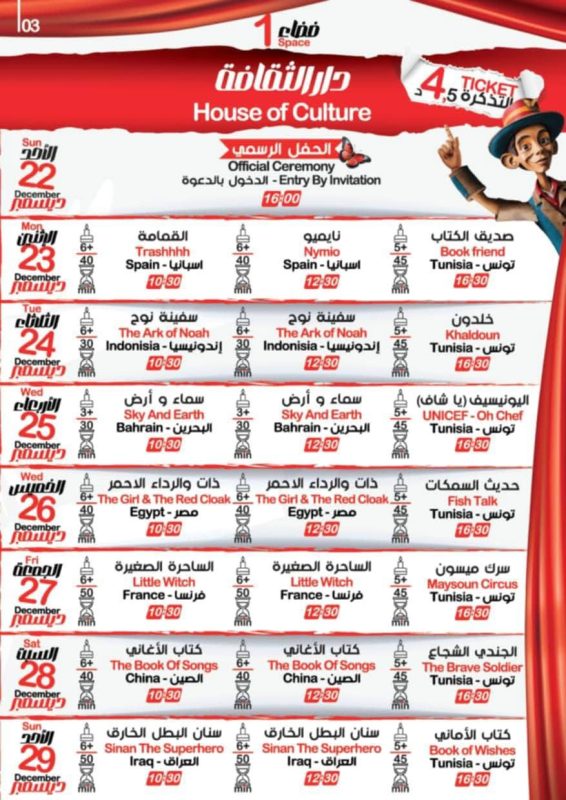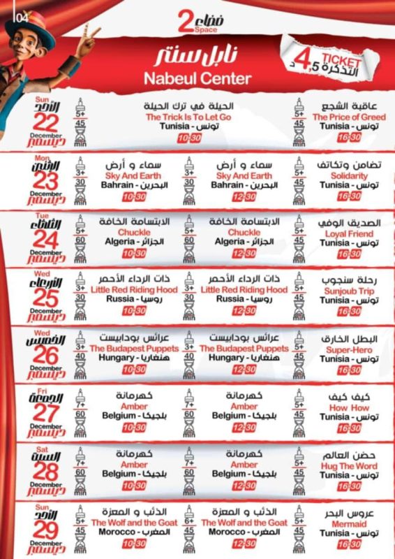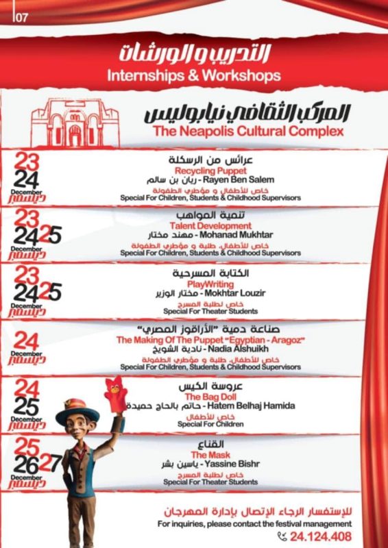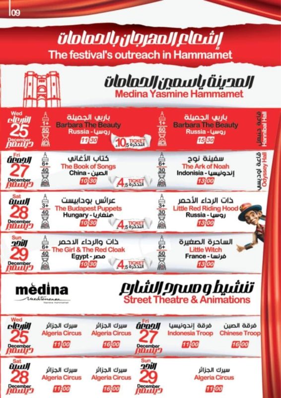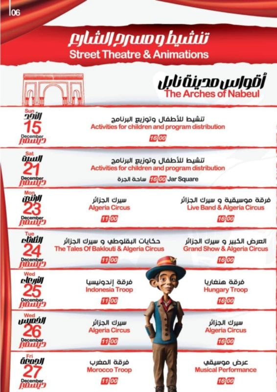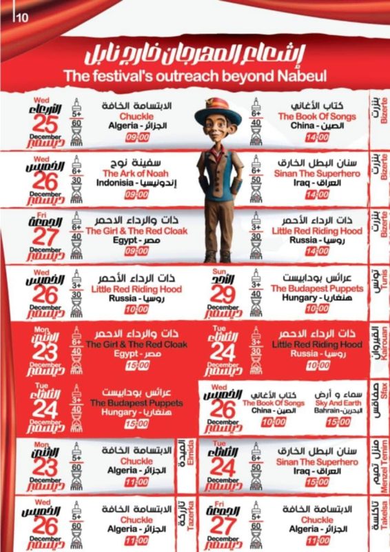 تحت إشراف وزارة الشؤون الثقافية التونسية والمندوبية الجهوية للشؤون الثقافية بنابل تنتظم الدورة 37 من مهرجان نيابوليس الدولي لمسرح الطفل والذي انطلقت فعالياته يوم 22 ديسمبر ويتواصل إلى غاية 29 ديسمبر 2024.
