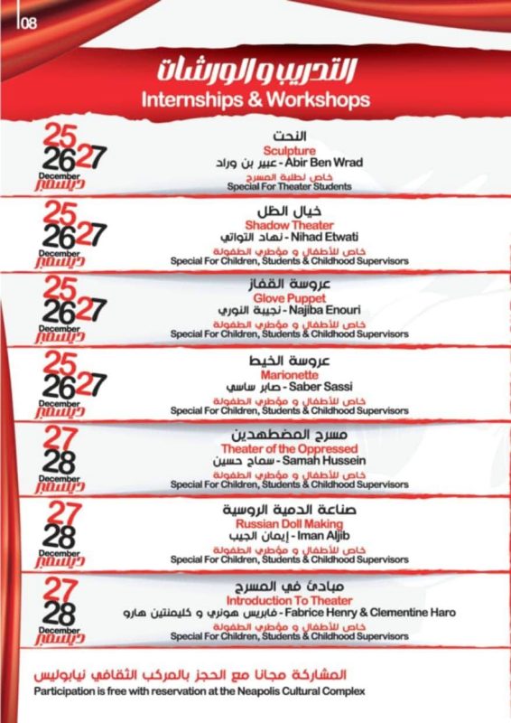 وتقام العروض بفضاء دار الثقافة نابل والمركب الثقافي نيابوليس ونول قايا ونزل الخيام قاردن ودار جيلان وأقواس مدينة نابل لعروض مسرح الشارع وفضاء المدينة ياسمين الحمامات.