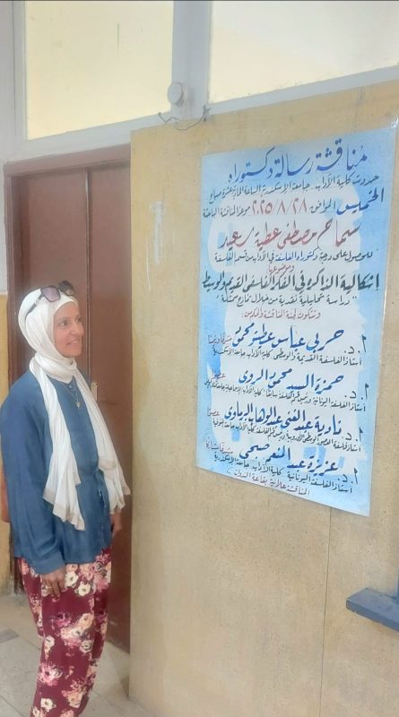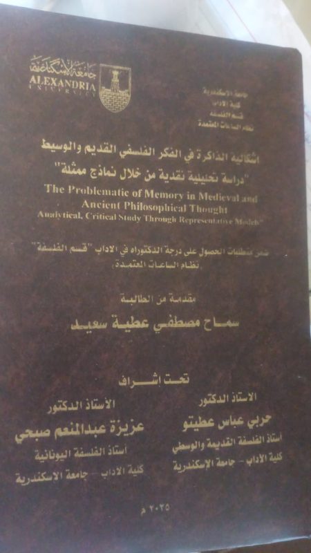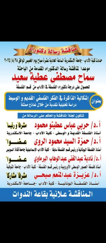 د. سماح مصطفى عطية سعيد لحصولها على درجة الدكتوراه في الفلسفة من كلية الآداب – جامعة الإسكندرية،