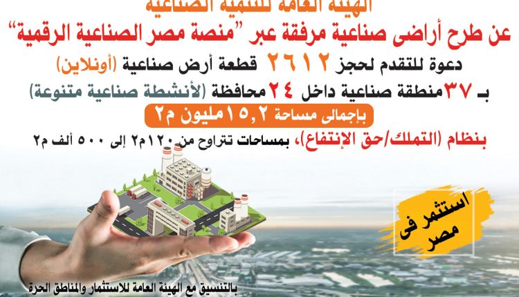 أعلن الفريق مهندس/ كامل الوزير نائب رئيس مجلس الوزراء للتنمية الصناعية وزير الصناعة والنقل إطلاق وزارة الصناعة مُمثلة في الهيئة العامة للتنمية الصناعية المرحلة الثامنة لطرح الأراضي الصناعية المرفقة من خلال منصة مصر الصناعية الرقمية عبر خريطة الاستثمار الصناعي اعتباراً من اليوم على أن يتم غلق باب التقدم يوم 8 ديسمبر، وتضم 2612 قطعة جديدة على مساحة إجمالية 15 مليون و207 ألف متر مربع موزعة على 37 منطقة صناعية في 24 محافظة على مستوى الجمهورية بأنشطة صناعية متنوعة.