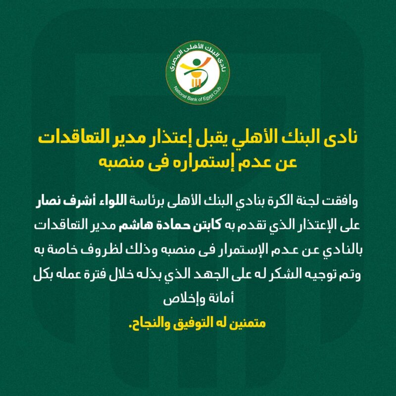 وافقت لجنة الكرة بنادي البنك الأهلى برئاسة اللواء أشرف نصار على الإعتذار الذي تقدم به كابتن حمادة هاشم مدير التعاقدات بالنادي عن عدم الإستمرار فى منصبه وذلك لظروف خاصة به