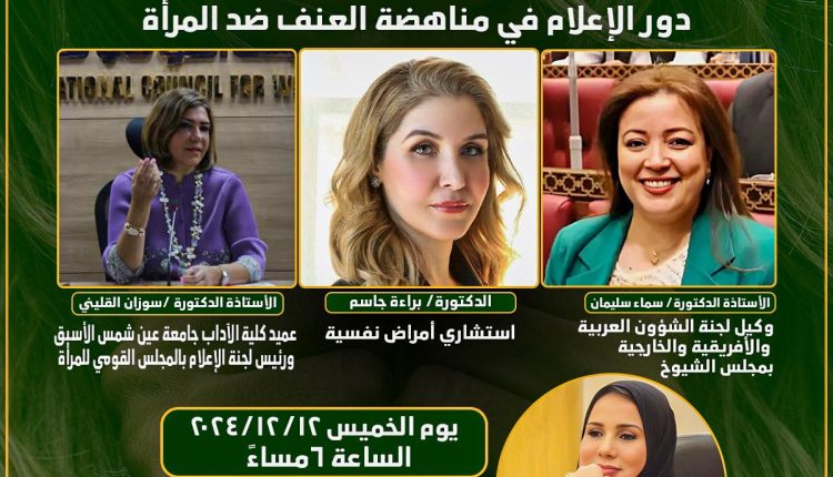 في السادسة مساءا الموافق ١٢ ديسمبر 2024 ومن المقرر حضور الأستاذة الدكتورة سماء سليمان وكيل لجنة الشؤون العربية والأفريقية والخارجية بمجلس الشيوخ والدكتورة براءة جاسم استشاري أمراض نفسية والأستاذة الدكتورة سوزان القليني