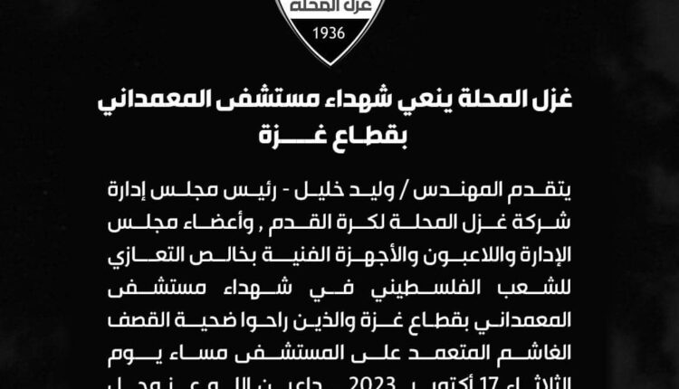 يتقدم المهندس وليد خليل رئيس مجلس إدارة شركة غزل المحلة لكرة القدم , وأعضاء مجلس الإدارة واللاعبون والأجهزة الفنيـة بخالص التعـازي للشعب الفلسطيني في شهداء مستشفى المعمداني بقطاع غـزة والذين راحوا ضحيـة القصف الغاشم المتعمد على المستشفى مساء يـوم الثلاثاء 17 أكتوبر 2023 , داعين الله عز وجل أن يلهم أهل فلسطين الغاليـة الصبر والصمــود