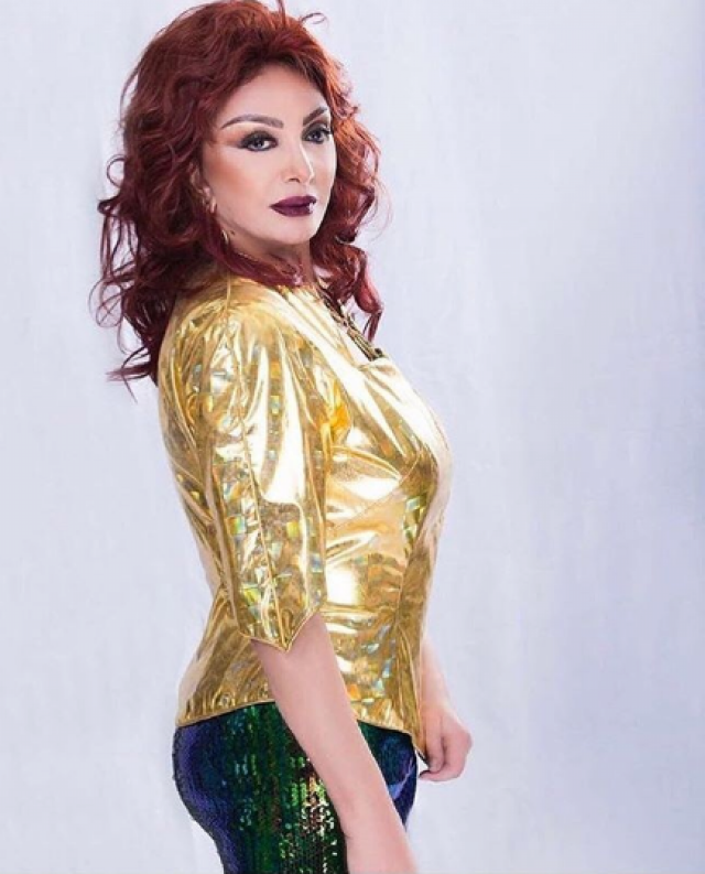 واختارت الممثلة الكبيرة إطلالة براقة بقميص ذهبي وبنطال يختلف لمعانه من درجات الأخضر الى الكحلي.