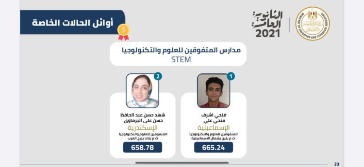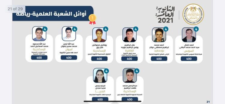 وأن “نسبة النجاح العامة لدفعة الثانوية العامة المصرية ٢٠٢٠-٢٠٢١ هى ٧٤٪ وسوف يدخل الدور الثاني ١٥٣،٣٩٦ طالباً وطالبة بدءاً من ٤ سبتمبر ٢٠٢١.”
