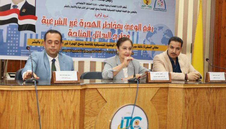 تحت رعايه الدكتور عصام فرحات رئيس جامعه المنيا ، استضافت الجامعه اللجنه الوطنيه التنسيقيه لمكافحه ومنع الهجره غير الشرعيه والاتجار بالبشر ، برئاسه السفيره نائله جبر ، لاقامه ندوه توعويه بعنوان “التوعيه بمخاطر الهجره غير الشرعيه وطرح البدائل المتاحه” ، نظمت الندوه اداره النشاط الاجتماعي بالاداره العامه لرعايه الطلاب ، بمشاركه اعضاء هيئه التدريس وطلاب الجامعه ، وبحضور الدكتور حسام عبد الرحيم منسق عام الانشطه انشطه الطلابيه ، واستاذ وليد عبد القوي مدير عام رعايه الطلاب ، ومنسقى الانشطه ومديري الإدارات والاخصائيين .