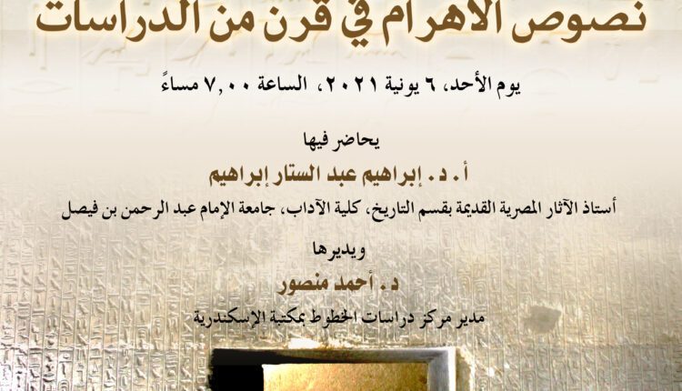 تنظم مكتبة الإسكندرية محاضرة عبر الإنترنت بعنوان “نصوص الأهرام في قرن من الدراسات”، يلقيها الأستاذ الدكتور إبراهيم عبد الستار إبراهيم، أستاذ الآثار المصرية القديمة قسم التاريخ- كلية الآداب- جامعة الإمام عبد الرحمن بن فيصل. وتبث المحاضرة يوم الأحد 6 يونية في تمام الساعة السابعة مساءًا على صفحة مركز دراسات الخطوط على الفيسبوك.