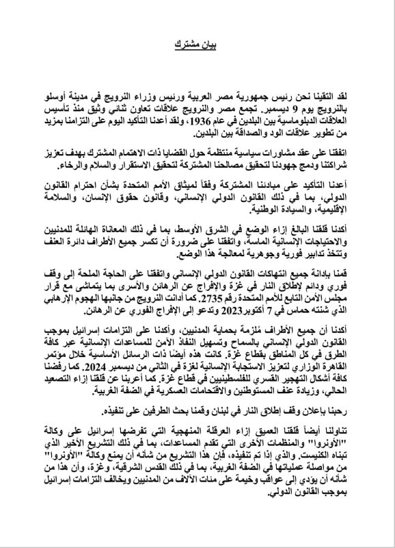 نشرت الصفحة الرسمية للمتحدث باسم رئاسة الجمهورية البيان المصري-النرويجي المشترك، والذي تم الاتفاق عليه بين البلدين في إطار متابعة نتائج زيارة الرئيس عبد الفتاح السيسي إلى العاصمة النرويجية “أوسلو” خلال الفترة من 8 إلى 10 ديسمبر 2024، وذلك ضمن الجولة الأوروبية للرئيس.