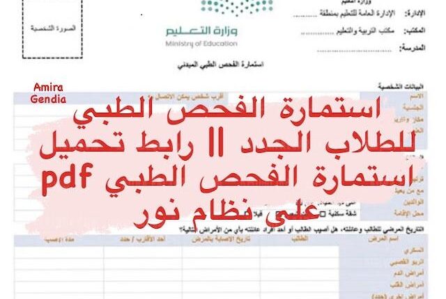 قام وكيل وزارة التربية والتعليم بالتأكيد على قبول نموذج الفحص الطبي الذي سوف يتم إرساله عن طريق منصة صحة بشكل إلكتروني في نظام نور من غير أن يتم طلب استمارة ورقية، كما يمكنكم أن تقوم بالحصول على الاستمارة الخاصة بالكشف الطبي 1443 بجانب استمارة اللياقة البدنية عن طريق :