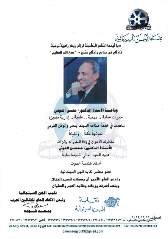 نشاطركم الأحزان في وفاة المغفور له بإذن اللّٰه الأستاذ الدكتور/ محسن التوني عميد المعهد العالي للسينما سابقا أستاذ هندسة الصوت عضو مجلس نقابة المهن السينمائية وندعو العلي القدير أن يسكنه فسيم الجنات ويلهم أسرته وزملائه وطلابه الصبر والسلوان.