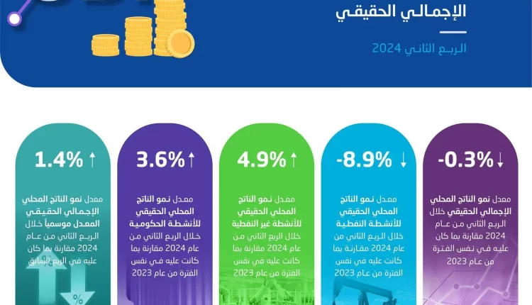 وسجَّل الناتج المحلي الإجمالي الحقيقي المعدَّل موسميًا خلال الربع الثاني من عام 2024م ارتفاعًا بلغت نسبته 1.4% مقارنة بما كان عليه في الربع الأول من عام 2024م.