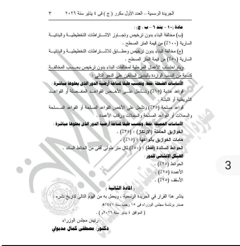 قررت الحكومة برئاسة المهندس مصطفى مدبولي رئيس مجلس الوزراء بتعديل بعض أحكام اللائحة التنفيذية لقانون التصالح في بعض مخالفات البناء وتقنين أوضاعها 36 لسنة 2026 الصادرة بقرار رئيس مجلس الوزراء رقم 1121 لسنة 2024 .