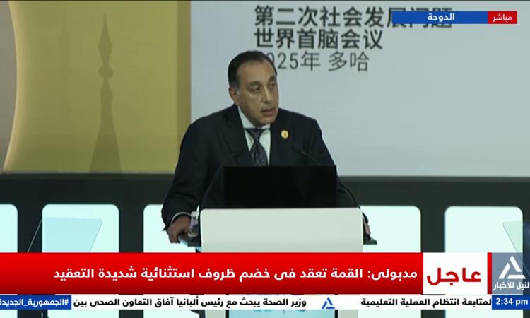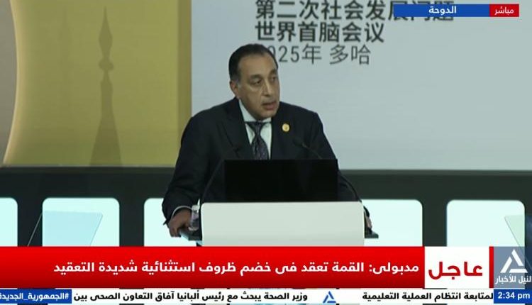 ألقى الدكتور مصطفى مدبولي رئيس مجلس الوزراء ، كلمة نيابة عن الرئيس عبد الفتاح السيسي، القمة العالمية للتنمية الإجتماعية بالدوحة، اليوم الثلاثاء.