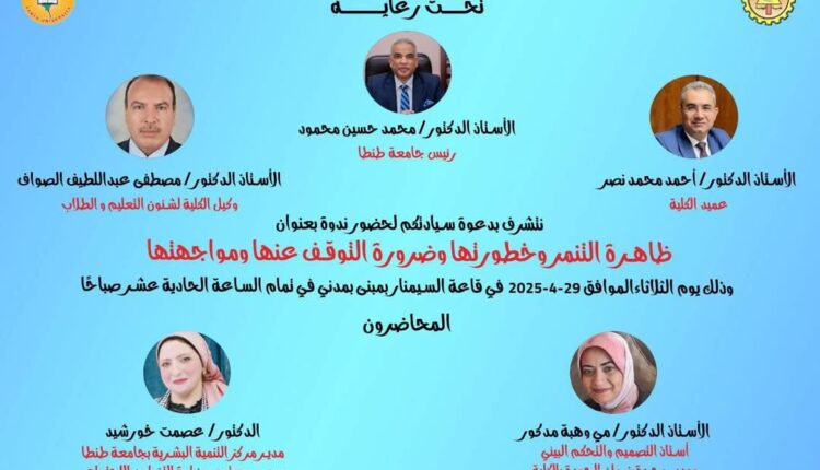 تعلن كلية الهندسة جامعة طنطا عن عقد ندوة بعنوان ” ظاهرة التنمر وخطورتها وضرورة التوقف عنها ومواجهتها “، تحت رعاية الأستاذ الدكتور محمد حسين محمود رئيس جامعة طنطا و الأستاذ الدكتور أحمد محمد نصر عميد كلية الهندسة والأستاذ الدكتور مصطفى الصواف وكيل كلية الهندسة لشئون التعليم والطلاب، وذلك يوم الثلاثاء القادم الموافق 29 ابريل 2025م بقاعة السمينار بمبنى مدني بكلية الهندسة جامعة طنطا فى تمام الساعة 11 صباحًا. يحاضر بالندوة الأستاذ الدكتور مى وهبه مدكور أستاذ التصميم والتحكم البيئي ومدير وحدة ضمان الجودة بكلية الهندسة وزميل كلية الدفاع الوطني بالأكاديمية العسكرية للدراسات العليا والإستراتيجية و الدكتور عصمت خورشيد مدير مركز التنمية البشرية بجامعة طنطا ومدرب معتمد بوزارة التضامن الاجتماعي .