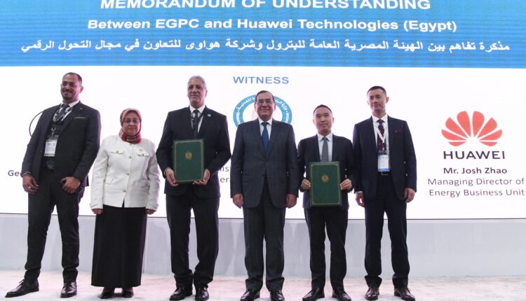 وقع مذكرة التفاهم الجيولوجي علاء البطل الرئيس التنفيذي لهيئة البترول مع السيد جوش تشاو مدير وحدة اعمال الطاقة بشركة هواوي بحضور المهندسة ايمان وافي مساعد رئيس هيئة البترول لتكنولوجيا المعلومات و مسئولي شركة هواوي .
