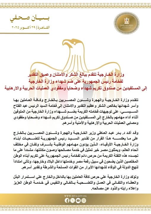 تتقدم وزارة الخارجية والهجرة وشئون المصريين بالخارج وكافة العاملين بها وأسر شهدائها بخالص الشكر وعظيم التقدير والامتنان إلى الرئيس عبد الفتاح السيسي، على توجيهاته الكريمة بضم شهداء وزارة الخارجية من المتوفين أثناء أداء مهامهم بالخارج إلى المستفيدين من صندوق تكريم شهداء وضحايا ومفقودي ومصابي العمليات الحربية والإرهابية والأمنية وأسرهم.