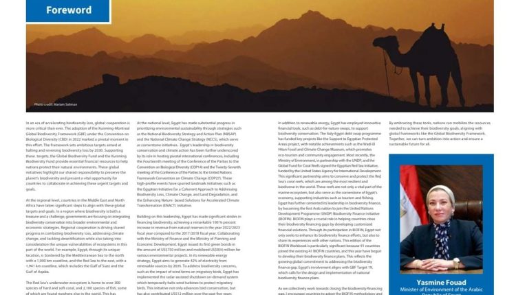 وكانت الدكتورة ياسمين فؤاد وزيرة البيئة قد اكدت في مقدمة التقرير على أهمية اعتماد إطار كونمينغ-مونتريال العالمي للتنوع البيولوجي في عام 2022 في تحديد أهداف طموحة لوقف وعكس فقدان التنوع البيولوجي بحلول عام 2030. ودور صندوق التنوع البيولوجي العالمي وصندوق كونمينغ للتنوع البيولوجي في توفير موارد مالية أساسية لمساعدة الدول على حماية بيئاتها الطبيعية. واشارت إلى الخطوات الكبيرة التي اتخذتها البلدان في الشرق الأوسط وشمال إفريقيا للتوافق مع هذه الأهداف والغايات العالمية. كما استعرضت الخطوات الهامة التي اتخذتها مصر وطنيا في تمويل التنوع البيولوجي ، في ظل إعطاء الأولوية للاستدامة البيئية من خلال استراتيجيات مثل الاستراتيجية الوطنية للتنوع البيولوجي وخطة العمل والاستراتيجية الوطنية لتغير المناخ، وذلك من خلال تنفيذ مشروعات التنوع البيولوجي، واستخدام أدوات مالية مبتكرة، مثل مبادلات الديون بالطبيعة، لدعم الحفاظ على التنوع البيولوجي، ومبادرة البحر الأحمر المصرية