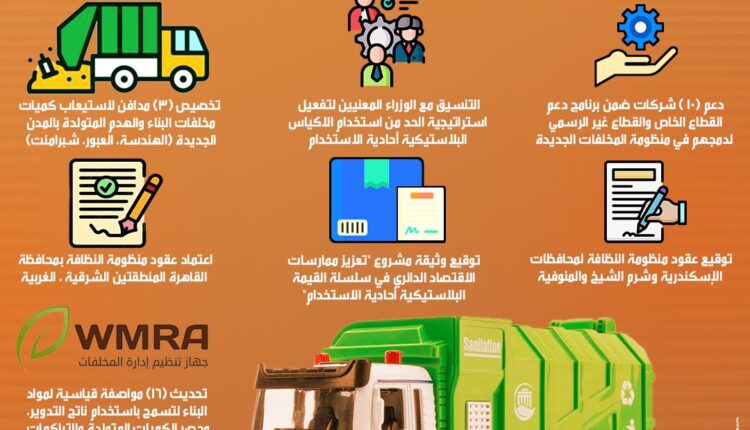 وأشارت وزيرة البيئة فيما يخص تنفيذ الاستراتيجية الوطنية لادارة مخلفات البناء والهدم، بالتعاون مع الوزارات والجهات المعنية، بناءً على التكليفات الرئاسية، إلى تقييم الكسارات المتنقلة للاستعانة بها في القضاء على الكميات المتراكمة من مخلفات الهدم والبناء، وحصر الكميات المتولدة والتراكمات التاريخية واعداد خطة استثمارية أولية، كما تم تخصيص (3) مدافن لاستيعاب كميات المخلفات المتولدة بالمدن الجديدة (الهندسة، العبور، شبرامنت)، وتحديث (16) مواصفة قياسية لمواد البناء لتسمح باستخدام ناتج التدوير