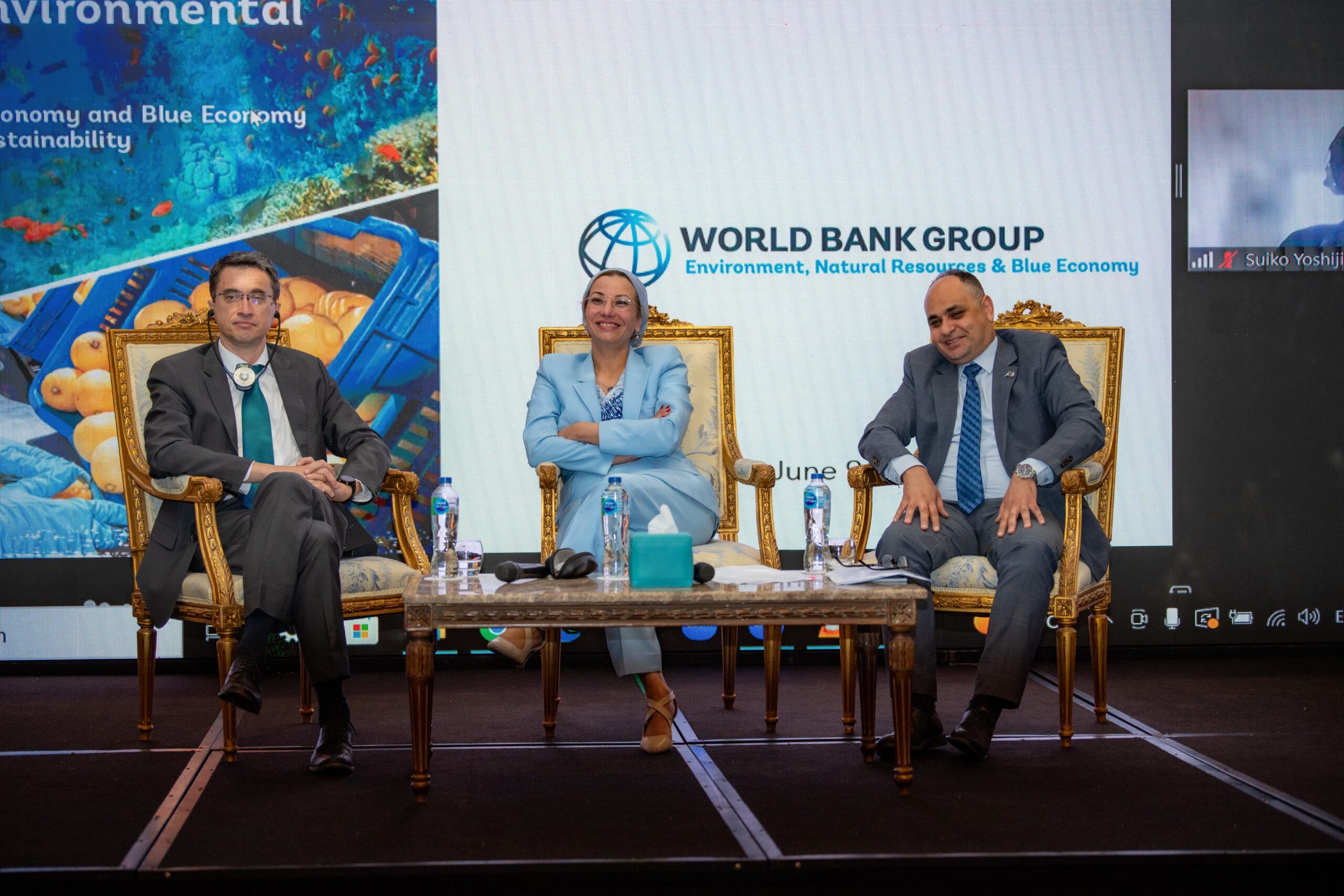 وقد استعرضت المهندسة داليا لطيف خبيرة البيئة ومدير الفريق الفنى بالبنك الدولي أن مفهوم الأقتصاد الأزرق بما يشمله من حماية للبيئة البحرية أو أنشطة استخراج البترول أو النقل البحرى ، حيث تم الاتفاق مع الحكومة المصرية على الاستمرار فى تقديم الدعم الفنى فيما يتعلق بالاقتصاد الأزرق وهو مفهوم يتعلق بالاستدامة والتكامل بين القطاعات الاقتصادية المطلوبة والحفاظ على البيئة و رأس المال الطبيعى ، والعمل على توفير فرص عمل ، وتنفيذ أنشطة بها تنمية إقتصادية ، ويشمل مجموعة من التحديات تتعلق بالبحث والتنمية و إعادة الحياة الطبيعية