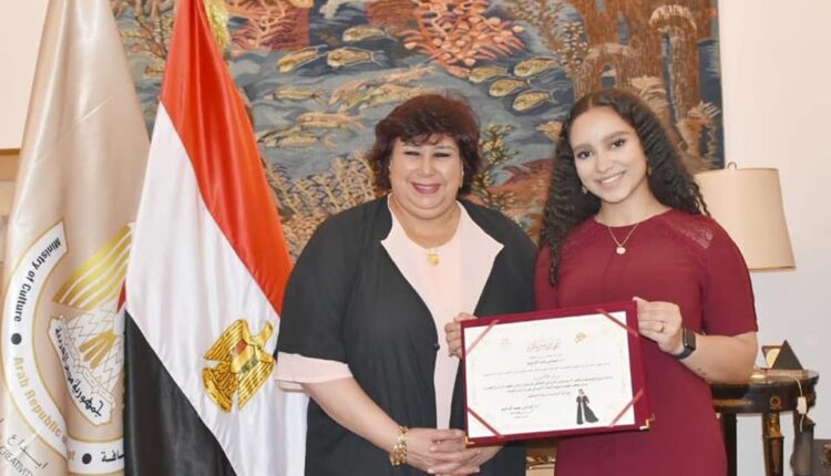 وخلال اللقاء كرمت وزيرة الثقافة الموهبة المتميزة بإهدائها درع وزارة الثقافة وشهادة تقدير نظرا لمساهمتها في إعطاء صورة مضيئة عن الفن المصري بالخارج، وشجعتها على بذل مزيد من الجهد والتفوق في مسيرتها الفنية .