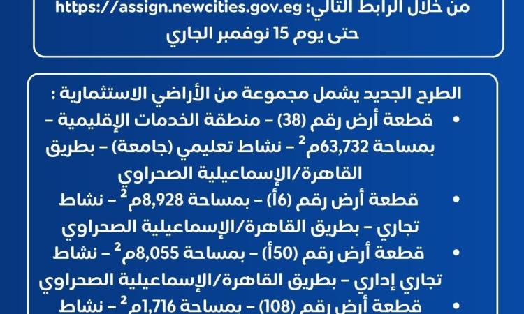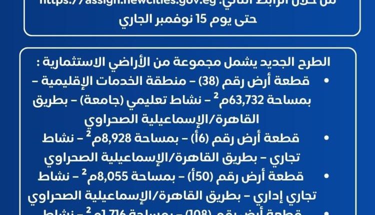 وأوضح المهندس محمود مراد، رئيس جهاز تنمية مدينة العبور الجديدة، أن الطرح الجديد يشمل مجموعة من الأراضي الاستثمارية المميزة على النحو التالي: قطعة أرض رقم (38) – منطقة الخدمات الإقليمية – بمساحة 63,732م² – نشاط تعليمي (جامعة) – بطريق القاهرة/الإسماعيلية الصحراوي، وقطعة أرض رقم (6أ) – بمساحة 8,928م² – نشاط تجاري – بطريق القاهرة/الإسماعيلية الصحراوي، وقطعة أرض رقم (50أ) – بمساحة 8,055م² – نشاط تجاري إداري – بطريق القاهرة/الإسماعيلية الصحراوي، وقطعة أرض رقم (108) – بمساحة 1,716م² – نشاط تجاري إداري – بالحي 39، وقطعة أرض رقم (158) – بمساحة 1,876م² – نشاط طبي – بالحي 39.