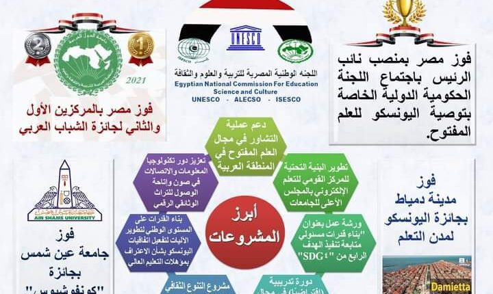 ولفت التقرير إلى فوز مصر بمنصب نائب الرئيس باجتماع اللجنة الحكومية الدولية الخاصة بتوصية اليونسكو للعلم المفتوح عام 2021، كما فازت مدينة دمياط بجائزة اليونسكو لمدن التعلم لعام 2021، فضلاً عن فوز مصر بالمركزين الأول والثاني لجائزة الشباب العربي، وفوز جامعة عين شمس بجائزة “كونفوشيوس” لمحو الأمية، بالإضافة إلى استضافة مصر المنتدى الإقليمي الأول للعلم المفتوح في الدول العربية بجامعة الجلالة، بالتعاون مع منظمة اليونسكو، وكذلك أعمال المجلس التنفيذي “الدورة الـ42″، والمؤتمر العام “الدورة الـ14” لمنظمة العالم الإسلامي للتربية والعلوم والثقافة (الإيسيسكو) برعاية وتشريف السيد عبدالفتاح السيسي رئيس الجمهورية، إضافة إلى تنظيم المشاورات الإقليمية الخاصة بمسودة الذكاء الاصطناعي، والتي أطلقتها منظمة اليونسكو للدول الأعضاء.