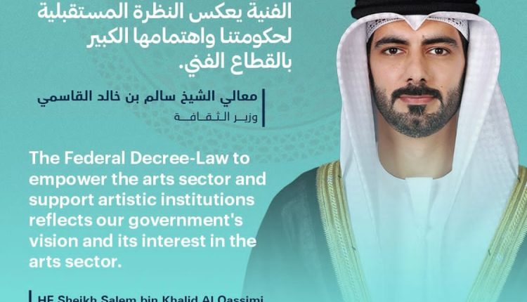 أشاد معالي سالم بن خالد القاسمي وزير الثقافة الإماراتي بحرص القيادة الرشيدة – حفظها اللّٰه- على دعم وتعزيز الحراك الفني والثقافي بكافة الوسائل التي تضمن النهوض به، مؤكداً أن المرسوم بقانون اتحادي لتمكين قطاع الفنون ودعم المؤسسات الفنية يأتي ليعكس النظرة المستقبلية للحكومة واهتمامها الكبير بالقطاع الفني. كما يدعم هذا التوجه تشجيع الإنتاج الفني للأفراد المبدعين واستقطاب الموهوبين والفنانين من جميع أنحاء العالم.