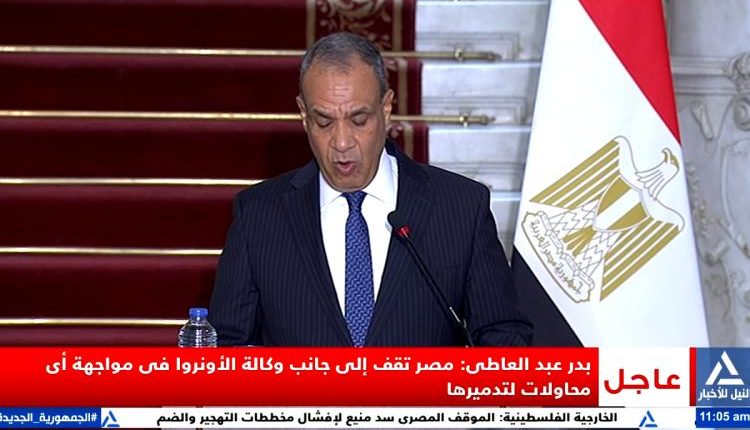أكد الدكتور بدر عبد العاطي وزير الخارجية والهجرة وشئون المصريين بالخارج ، أن مصر تقف إلى جانب وكالة الأونروا في مواجهة أي محاولات لتدميرها.