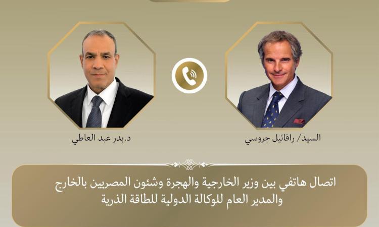 جرى اتصال هاتفي بين د. بدر عبد العاطي وزير الخارجية والهجرة وشئون المصريين بالخارج ورافائيل جروسى المدير العام للوكالة الدولية للطاقة الذرية امس الجمعة.