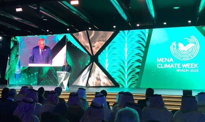شارك السيد سامح شكري وزير الخارجية اليوم الأحد ٨ أكتوبر ٢٠٢٣ بصفته رئيس الدورة الـ٢٧ لمؤتمر المناخ COP27 في أسبوع المناخ في منطقة الشرق الأوسط وشمال إفريقيا لعام ٢٠٢٣، والذي يعقد خلال الفترة من ٨ إلى ١٢ أكتوبر الجاري بالعاصمة السعودية الرياض، حيث ألقى كلمة خلال الجلسة الإفتتاحية لتلك الاجتماعات، وذلك بحضور كل من سمو الأمير عبد العزيز بن سلمان وزير الطاقة السعودي والدكتور سلطان الجابر الرئيس المُعين للدورة الـ٢٨ لمؤتمر المناخ COP28.