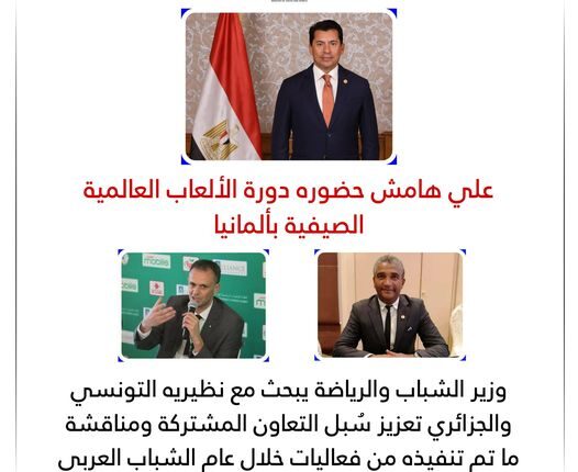 على هامش حضور دورة الألعاب العالمية الصيفية للأولمبياد الخاص والتي تستضيفها العاصمة الألمانية برلين، خلال الفترة من (17-25) يونيو الجاري، بمدينة برلين الألمانية، بمشاركة 170 دولة، من بينهم 20 دولة عربية، التقى الدكتور أشرف صبحي وزير الشباب والرياضة، كل من كمال دقيش وزير الشباب والرياضة التونسي، وعبد الرحمن حماد وزير الشباب والرياضة الجزائري، لبحث تعزيز سُبل التعاون المشتركة.