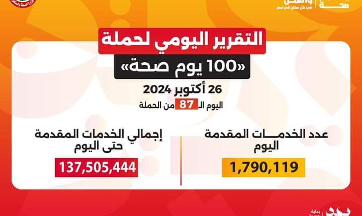 أعلن الدكتور خالد عبدالغفار نائب رئيس مجلس الوزراء ووزير الصحة والسكان، تقديم 137 مليون و505 آلاف و444 خدمة طبية من خلال حملة «100 يوم صحة» منذ إطلاق الدكتور مصطفى مدبولي رئيس مجلس الوزراء، للنسخة الثانية، مساء يوم 31 يوليو 2024، وحتى مساء أمس السبت 26 أكتوبر، وفي إطار مبادرة السيد الرئيس عبدالفتاح السيسي، «بداية جديدة لبناء الإنسان».