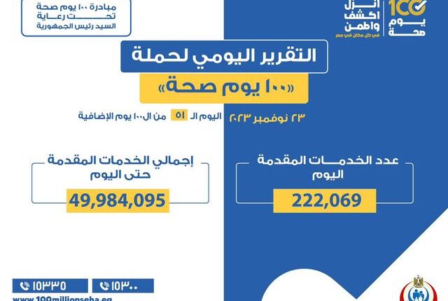أعلن الدكتور خالد عبدالغفار وزير الصحة والسكان، تقديم 49 مليونا و984 ألفا و95 خدمة طبية من خلال حملة «100 يوم صحة» منذ انطلاقها يوم 25 يونيو الماضي، وحتى مساء أمس الخميس 23 نوفمبر، في جميع محافظات الجمهورية، وذلك بعد توجيهات فخامة الرئيس عبدالفتاح السيسي بمد عمل الحملة.
