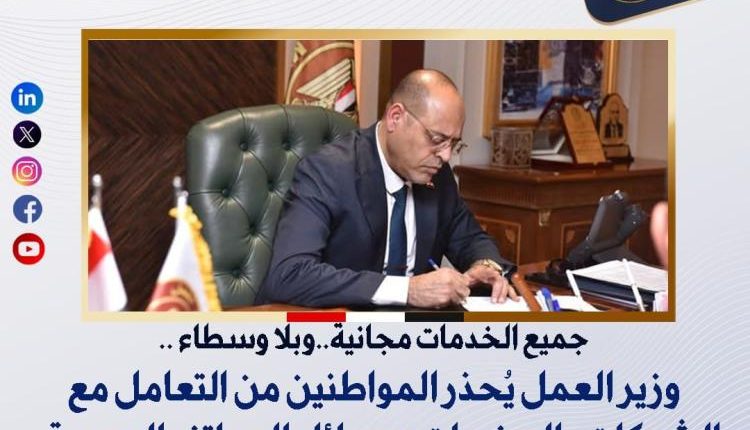 ونبه الوزير، إلى عدم التعامل مع هذه الكيانات المزيفة، وسرعة الابلاغ عنها لدي مباحث الأموال العامة، وشرطة الإنترنت، موضحاً أن كافة خدمات الوزارة مجانية، وبدون أي رسوم، وأنه لا توجد شركات وسيطة، وأن التعامل يكون بشكل مباشر مع الوزارة، أو مديريات العمل بالمحافظات، للإستفسار عن كل المعلومات التي تخص فرص العمل، أو العمالة غير المُنتظمة، أو خدمات “الوزارة” بشكل عام، وحذر المواطنين، من الإدلاء ببياناتهم الشخصية لأي شخص يدعي انتسابه للوزارة.