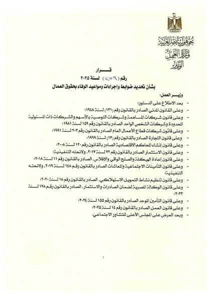 تفاصيل القرار الوزاري رقم (259) لسنة 2025 بشأن تحديد ضوابط وإجراءات ومواعيد الوفاء بحقوق العمال..نص القرار