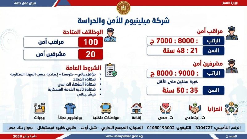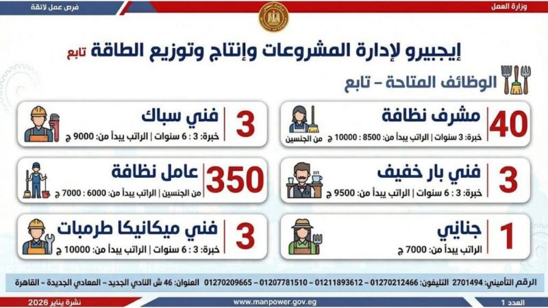 وبيّنت الوزارة أن التقديم على هذه الفرص يتم خلال شهر يناير 2026، من خلال الإدارة العامة للتشغيل بمقر الوزارة القديم بمدينة نصر، أو عبر مديريات العمل بالمحافظات، كما يمكن التقديم مباشرة من خلال بيانات الشركات المرفقة بالنشرة، أو عبر الموقع الرسمي لوزارة العمل على شبكة الإنترنت.. وأضافت أن نشرة التوظيف نصف الشهرية تصدر بصفة منتظمة كل 15 يوما من خلال الإدارة العامة للتشغيل، برئاسة هبة أحمد، وإعداد منى شوقي – باحث أول بالإدارة، وتتضمن أحدث فرص العمل المتاحة في المحافظات.