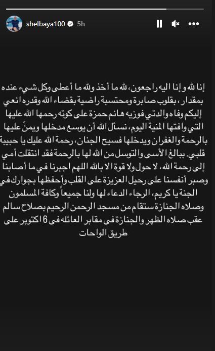 وكتبت أمينة شلباية: “نسأل الله أن يوسع مدخلها ويمنّ عليها بالرحمة والغفران ويدخلها فسيح الجنان، رحمة الله عليك يا حبيبة قلبي، ببالغ الأسى والتوسل من الله لها بالرحمة فقد انتقلت أمي إلى رحمة الله، لا حول ولا قوة الا بالله اللهم أجرنا في ما أصابنا وصبر أنفسنا على رحيل العزيزة على القلب”.