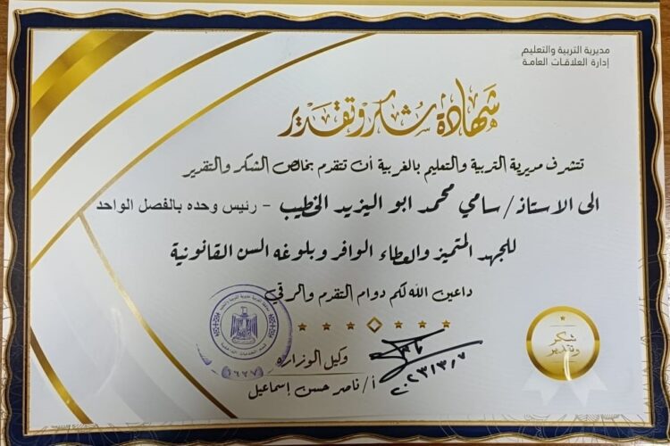 قام اليوم ناصر حسن، وكيل وزارة التربية والتعليم بالغربية، بتكريم سامي محمد أبو اليزيد الخطيب، رئيس وحدة بإدارة الفصل الواحد بالمديرية، لبلوغه سن التقاعد والإحالة إلى المعاش، وتسليمه شهادة تقدير، تكريماً لجهوده خلال سنوات عمله، متمنياً له دوام الصحة والسعادة وطول العمر.