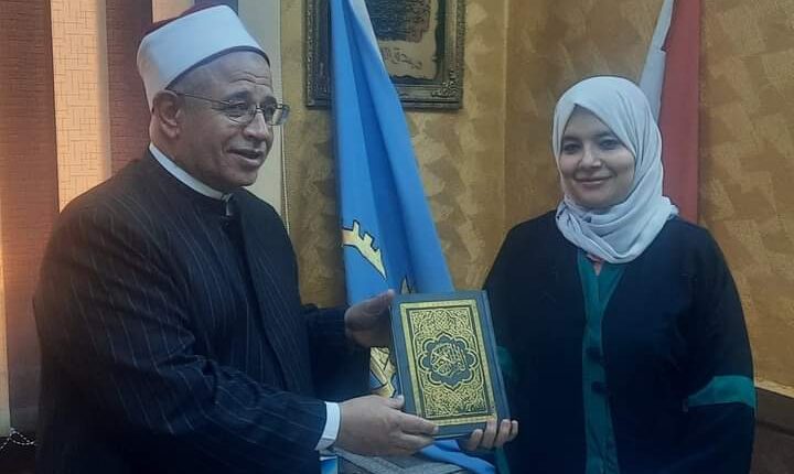 قام فضيلة الشيخ خالد خضر وكيل وزارة الأوقاف بالغربية مديرية أوقاف الغربية بتكريم الواعظة اسماء ابو المعاطي وقدم لها القران الكريم هدية وذلك لفوزها في مسابقة القرائة الصيفية لعام 2023 بجائزة قدرها 10 آلاف جنية