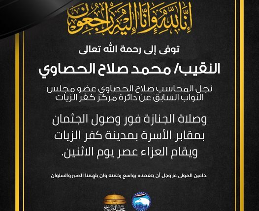 خالص العزاء للصديق والاخ النائب السابق صلاح محمود الحصاوي واللواء محمود الحصاوى وجميع عائلات الحصاوي بكفرالزيات والدلجمون في مصابهم. اللهم أغفر له وارحمه وعافه واعفو عنه وأجعل منزله الفردوس الأعلي . وإنا لله وإنا إليه راجعون.