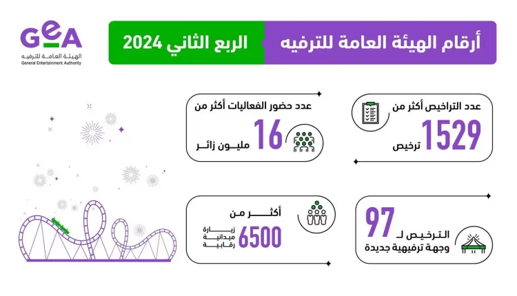 أعلنت الهيئة العامة للترفيه (GEA) عن وصول عدد زوار الفعاليات خلال الربع الثاني من العام الحالي إلى أكثر من 16 مليون زائر، بارتفاع نحو يقدر بنحو 130% عن الفترة نفسها من العام الماضي، حيث بلغ عدد الزوار 7 ملايين زائر.