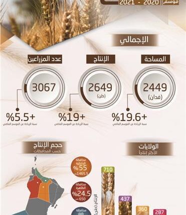 أعلنت سلطنة عُمان ارتفاع الإنتاج من محصول القمح خلال الموسم الزراعي الحالي 2020/2021م، إلى 2649 طنّاً محققاً زيادة بنسبة 19% مقارنة بالموسم الزراعي الماضي 2019/2020م.
