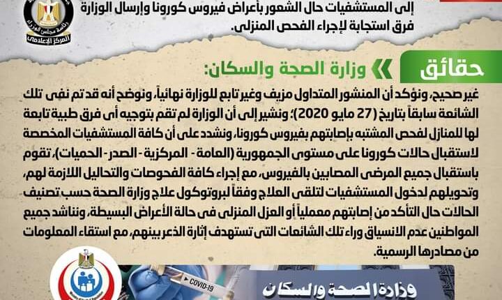 تداولت صفحات التواصل الاجتماعي منشوراً منسوباً لوزارة الصحة يحذر المواطنين بعدم الذهاب إلى المستشفيات حال الشعور بأعراض فيروس كورونا وإرسال الوزارة فرق استجابة لإجراء الفحص المنزلي، وقد قام المركز الإعلامي لمجلس الوزراء بالتواصل مع وزارة الصحة والسكان، والتي نفت تلك الأنباء، مُؤكدةً أنه لا صحة للمنشور المنسوب لوزارة الصحة الذي يحذر المواطنين بعدم الذهاب إلى المستشفيات حال الشعور بأعراض فيروس كورونا أو إرسال الوزارة فرق استجابة لإجراء الفحص المنزلي، وأن المنشور المتداول مزيف وغير تابع للوزارة نهائياً، مُوضحةً أنه قد تم نفي تلك الشائعة سابقاً بتاريخ (27مايو 2020)، مُشيرةً إلى أن الوزارة لم تقم بتوجيه أي فرق طبية تابعة لها للمنازل لفحص المشتبه بإصابتهم بفيروس كورونا، مُشددةً على أن كافة المستشفيات المخصصة لاستقبال حالات كورونا على مستوى الجمهورية (العامة – المركزية – الصدر – الحميات)، تقوم باستقبال جميع المرضى المصابين بالفيروس، مع إجراء كافة الفحوصات والتحاليل اللازمة لهم، وتحويلهم لدخول المستشفيات لتلقي العلاج وفقاً لبروتوكول علاج وزارة الصحة حسب تصنيف الحالات حال التأكد من إصابتهم معملياً أو العزل المنزلي في حالة الأعراض البسيطة، مُناشدةً جميع المواطنين عدم الانسياق وراء تلك الشائعات التي تستهدف إثارة الذعر بينهم، مع استقاء المعلومات من مصادرها الرسمية.