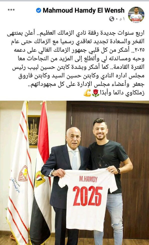 وقال الزمالك عبر بيان رسمي على موقعه، أن اللجنة المكلفة بإدارة نادي الزمالك برئاسة حسين لبيب، نجحت في تمديد عقد محمود حمدي الونش مدافع الفريق حتى عام 2025.