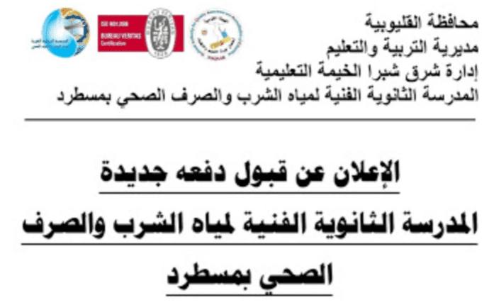 وقد أعلنت المدرسة الثانوية الفنية لمياه الشرب والصرف الصحي(بمسطرد) محافظةالقليوبية،  إدارة شرق شبرا الخيمة التعليمية  عن قبول دفعه جديدة من الطلاب الجدد (بنين فقط ).