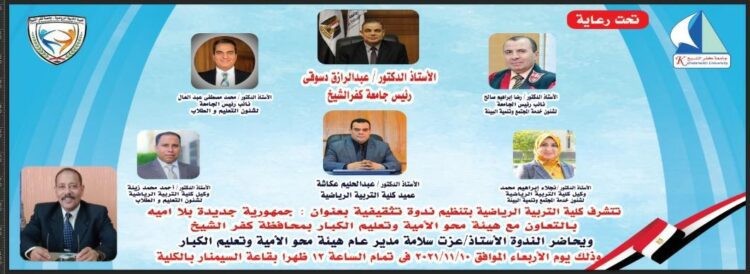 تحت رعاية الدكتور عبدالرازق دسوقي رئيس جامعة كفرالشيخ والدكتور رضا صالح نائب رئيس الجامعة لشئون خدمة المجتمع وتنمية البيئة، و الدكتور محمد عبد العال نائب رئيس الجامعة لشئون التعليم والطلاب ، نظمت كلية التربية الرياضية ندوة تثقيفية بعنوان “ جمهورية جديدة بلا أمية ” بالتعاون مع الهيئة القومية لتعليم الكبار بمحافظة كفرالشيخ وذلك اليوم الأربعاء الموافق 10- 11 – 2021 م ، بإشراف الدكتور عبد الحليم عكاشة عميد كلية التربية الرياضية ، بحضور الدكتور نجلاء إبراهيم وكيل الكلية لشؤون خدمة المجتمع وتنمية البيئة ،الدكتور أحمد محمد زينة وكيل الكلية لشؤون التعليم والطلاب ، الدكتور أحمد سليمان إبراهيم منسق الأنشطة الطلابية بالكلية، حاضر بالندوة مدير عام هيئة محو الأمية وتعليم الكبار عزت سلامة.