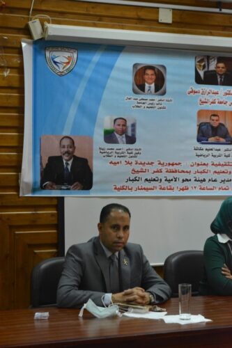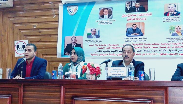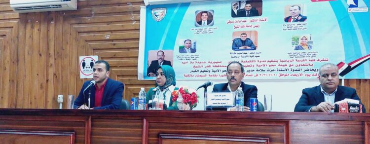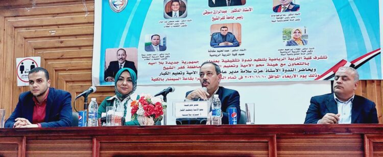 تحت رعاية الدكتور عبدالرازق دسوقي رئيس جامعة كفرالشيخ والدكتور رضا صالح نائب رئيس الجامعة لشئون خدمة المجتمع وتنمية البيئة، و الدكتور محمد عبد العال نائب رئيس الجامعة لشئون التعليم والطلاب ، نظمت كلية التربية الرياضية ندوة تثقيفية بعنوان “ جمهورية جديدة بلا أمية ” بالتعاون مع الهيئة القومية لتعليم الكبار بمحافظة كفرالشيخ وذلك اليوم الأربعاء الموافق 10- 11 – 2021 م ، بإشراف الدكتور عبد الحليم عكاشة عميد كلية التربية الرياضية ، بحضور الدكتور نجلاء إبراهيم وكيل الكلية لشؤون خدمة المجتمع وتنمية البيئة ،الدكتور أحمد محمد زينة وكيل الكلية لشؤون التعليم والطلاب ، الدكتور أحمد سليمان إبراهيم منسق الأنشطة الطلابية بالكلية، حاضر بالندوة مدير عام هيئة محو الأمية وتعليم الكبار عزت سلامة.
