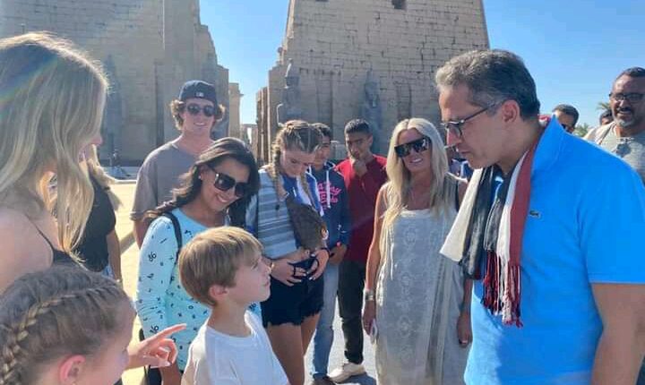 بمجموعة من السائحين من روسيا وأوكرانيا وفرنسا وألمانيا وانجلترا،أثناء جولته بمعابد الأقصر والكرنك،للوقوف على آخر مستجدات الموقف التنفيذي للتجهيزات النهائية الخاصة بفعالية “الأقصر…طريق الكباش”.